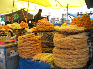 In Varanasi, I had to wake up by 4 something in the morning to make it to the bus station to catch the first bus to Saunali on the border with Nepal. In the pitch dark, I woke up an old man who was sleeping in the lobby of my hostel (in fact there were 3 men sleeping in the lobby), and with some provocation, I convinced him to walk me out to the main street. This was my first use of my headlamp, mostly to avoid the cow poop which is plentiful in the the alleys of Varanasi. When we reached the main street, my elderly escort woke up another man sleeping on a cart, who stumbled over to his rickshaw in a stupor and haggled with me about the price, and then we were off toward the station. I waited at the mosquito-infested station (first use of DEET) for about an hour, and then boarded the cramped, dirty, uncomfortable bus for the border. The driver complained that I was taking up an extra seat with my bag, and so with great difficulty I tried to shove it into the overhead shelf, but it wouldn't fit. Then I tried to wedge it under the seat. Bad idea. I had a water bottle hanging out of my bag, and it leaked all over the ground creating a sort of slurry of dirt and dust and water that I then rubbed my bag in. Realizing that I couldn't fit it under the seat, I lifted it up, smearing mud all over myself and then the seat as well. I find that days in India have their extreme highs and lows; this was a low moment. But-ah ha!-I had wet wipes with me! I wiped down the seat and the bag and myself, and then I realized that the entire bus of passengers was watching my struggle with amazement. Silly white girl with her wet wipes. Finally, I decided to move to the back of the bus where I could perhaps discreetly take up an extra seat with my bag. The journey that then ensued was an 11 hour, bumpy, slow, sweltering hell, with the dust from the semi-paved road coating my face and arms in a thick layer of filth. I will say that the Indian people are an amazingly patient bunch; my fellow passengers weathered the trip with utter composure, even though some were standing in the isle for distances of 100km. At one point when someone asked me about my bag taking up a seat, I laboriously hoisted it onto my lap, which then cut off my view entirely, practically suffocating me in my tiny seat. And the space that was now free was too small for a human--so the men just laughed and told me to put the bag back. In some ways, I loved this bus trip because it took me through every town and village from Varanasi to Nepal, getting stuck in every main street traffic jam, car horns blowing nearly constantly. It was a great viewpoint from which to watch the everyday lives of the people of India-- selling bananas at a roadside stand, brushing their teeth in the morning, peeling cucumbers for sale, repairing rickshaws, etc. I will also mention that I did not use the bathroom for 11 hours and ate only coconut cookies along the way. The one time I thought I would find a toilet during a 10 minute stop, I was afraid to stray too far from the bus (leaving my bag behind), and the locals kept directing me farther down the street to whatever shithole (literally) there was available. So I retreated back to the bus, resigned to holding it. When I got back on, the tiniest, thinest man I have ever seen (with sunken cheeks) was occupying my seat. I wedged him politely aside (he didn't really need a full seat). I was the only white person on the bus for the entire 11 hours. There was one Japanese guy, but I didn't notice him until we had already crossed the border. At one point, the bus stopped at a roadside restaurant, and about half of the passengers piled out to eat. I debated whether it was safe to eat there, but I noticed that the dishes were being washed in a pale of nasty brown water by the edge of the road, so I stayed on the bus. I'm sure I will eat in similar conditions during my trip, but I really didn't want diarrhea on the bus. I guess there is no good time for diarrhea. So, the journey continued to the border where it slowly became more rural and more poor and more beautiful, with rice paddies outnumbering rickshaws, and the roads becoming quieter. I took a final rickshaw to the Indian Immigration desk where I was stamped out, and then walked across the border. It was like night and day, like a breath of fresh air. Immediately in Nepal, I spotted a public toilet, and when I didn't have the 5 Nepali rupees I needed to use it, I told them that I would give them a 'smile,' and they accepted. The men at the Nepal immigration desk were very friendly and welcoming, directing me toward the bus station. After dodging some tourist bus touts, I bought some more coconut cookies, used the ATM, and boarded the night bus to Kathmandu. The seats on this bus were cloth and had been slept in by hundreds of sweating bodies, and so they were damp and smelled like the funk of humanity. In the middle of the night, the bus stopped at a restaurant and I ate my first Nepali meal of dal baat (with my hands), and it was delicious and hearty! Maybe the best meal I've had on my trip so far, and only $1. In some ways I'm so glad that it was dark and I couldn't see the journey to Kathmandu because the bus tore around hairpin curves at great speeds, missing oncoming buses by inches. All I saw all night were rock faces on both sides of the bus. Or just pure darkness; I have no idea what the terrain was like.