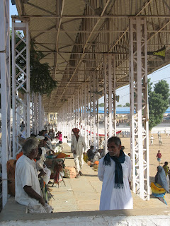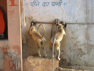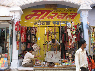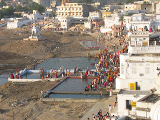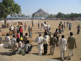 I have spent four days in Pushkar observing the fair and religious pilgrimage. The official events that are scheduled, such as camel racing and turban tying, are less than riveting and seem poorly organized, but the entire spectacle--the thousands of animals and people in this tiny town--is really incredible. It seems at times to be a child labor and animal cruelty fair--one Brazilian woman characterized it as a 'horror circus'. When a little girl balances on a tightrope to the beat of a drum and then asks me for money afterward, of course I want to give, but I know that by giving money to her I am furthering this sort of activity where families profit from their child's exploitation. There are also lots of monkeys on leashes and children doing somersaults and horses dancing and snakes in containers and camels pulling huge flatbed chalets (I don't know what these things are called).